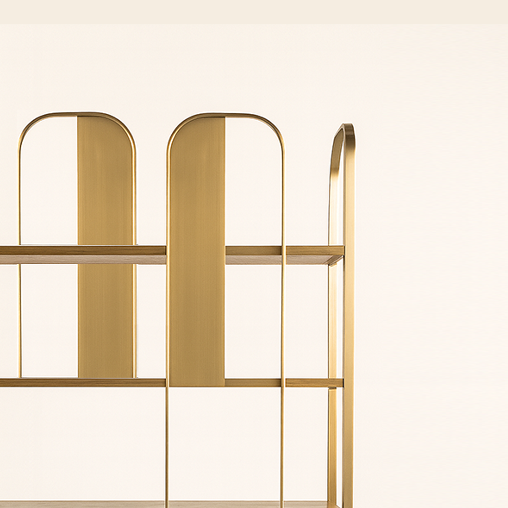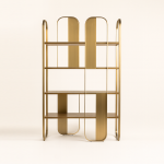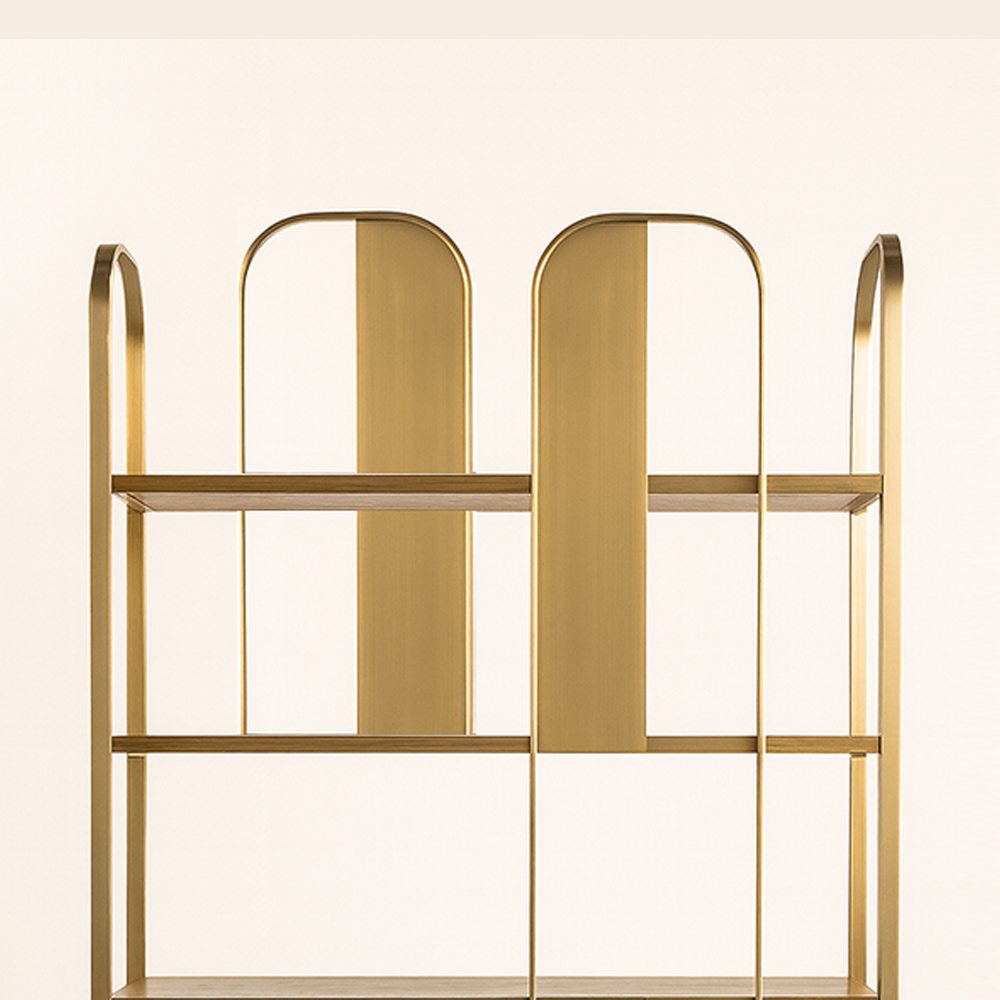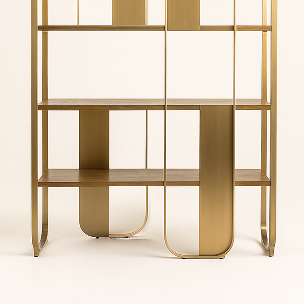 Modern golden bookshelf with wooden panels for elegant storage and display.