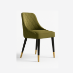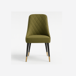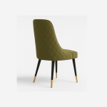 A sophisticated olive-green dining chair with quilted detailing, plush comfort, and sleek black legs with golden tips — a perfect balance of style and function.