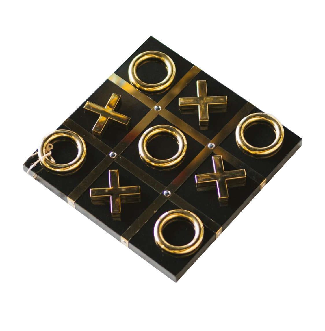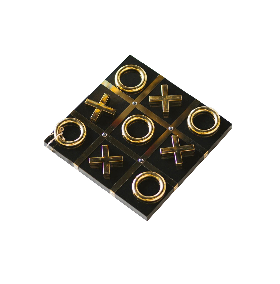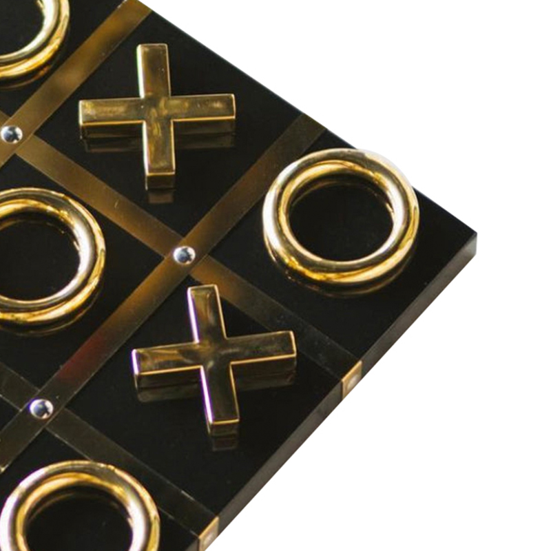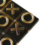 Luxurious tic-tac-toe game set featuring gold-tone X and O pieces on a sleek black board. Perfect for adding a touch of elegance to your game nights or as a stylish decorative piece for your coffee table.