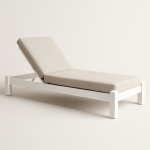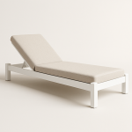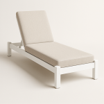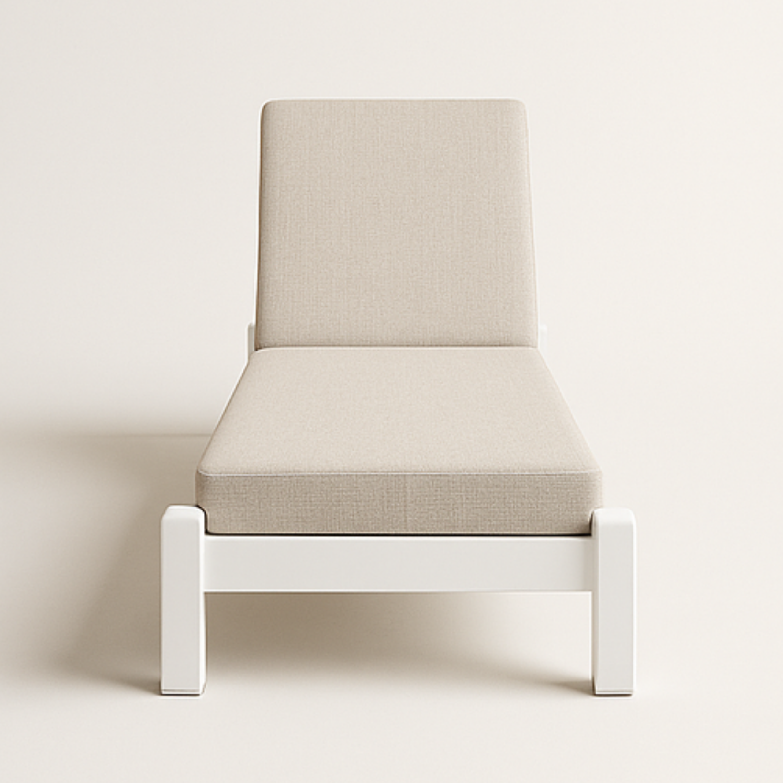 A modern outdoor sun lounger featuring a durable white aluminum frame, adjustable backrest, and plush weather-resistant cushions – perfect for poolside relaxation in coastal-inspired style.