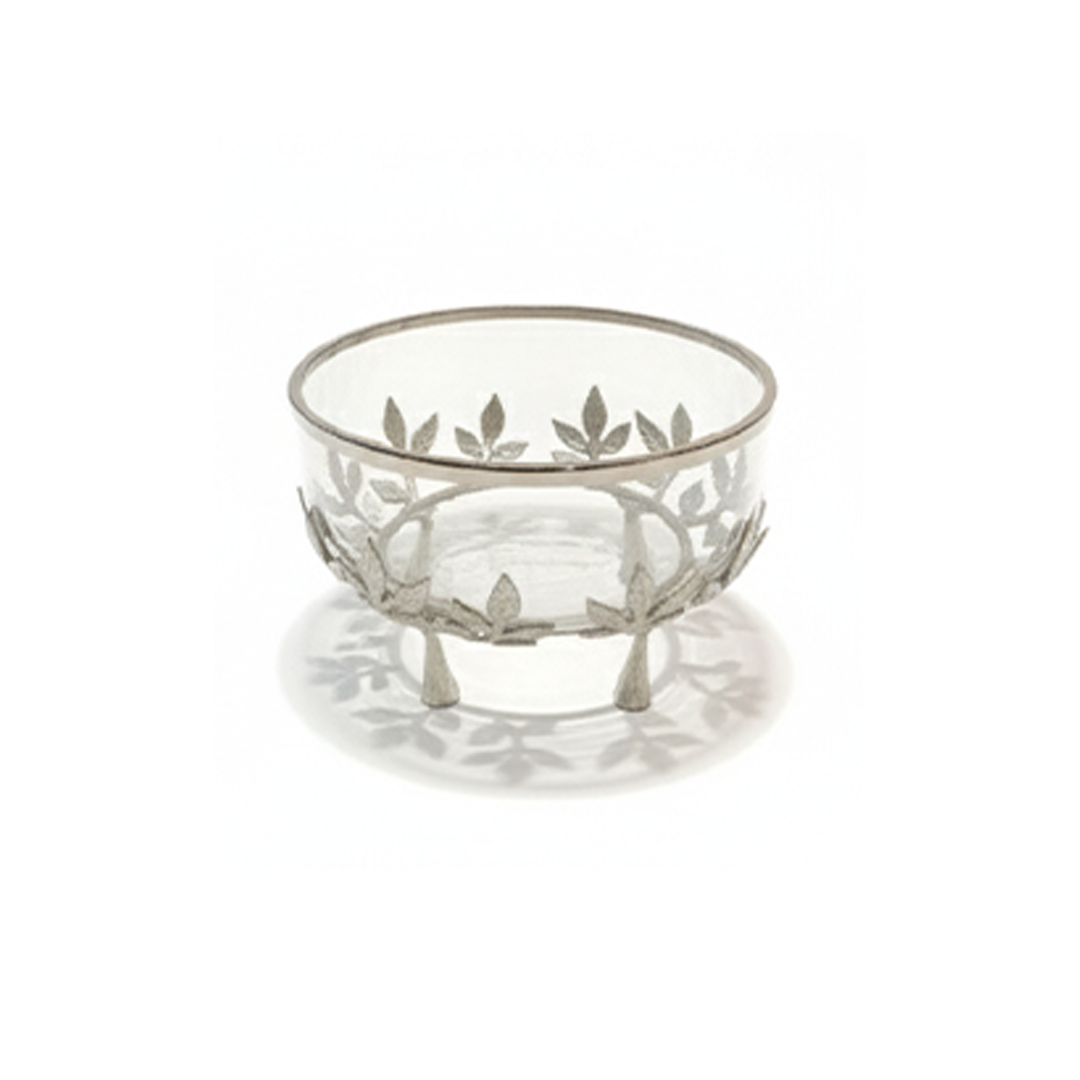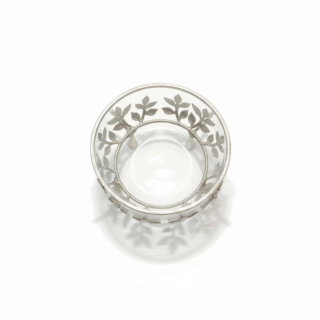 The Fiore Glass Ring Bowl merges functionality with artistic design, featuring a smooth, circular clear glass basin encircled by a subtle golden band. It rests securely upon a beautifully sculpted, open-work metal stand finished in gold, detailed with delicate floral and vine motifs. This versatile piece serves as an eye-catching centerpiece for fruit or potpourri, adding a touch of timeless botanical elegance to any table.
