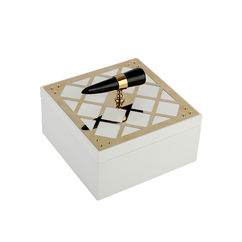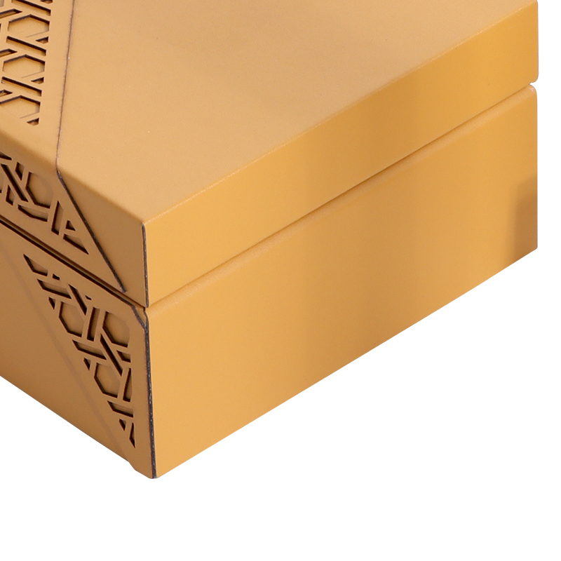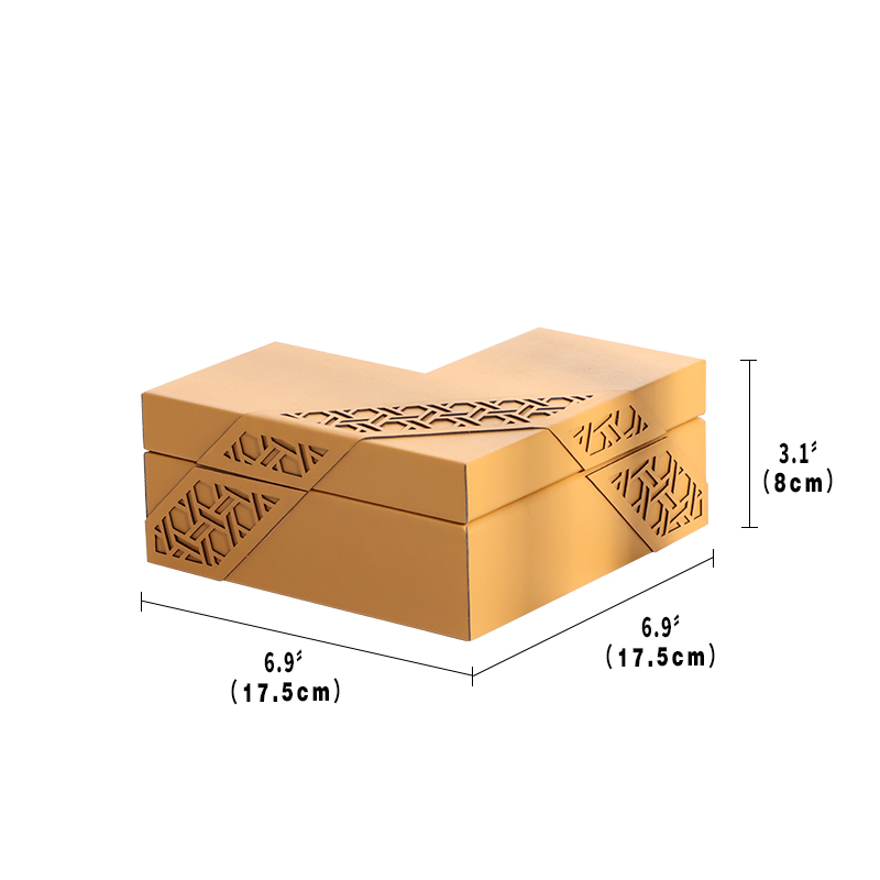 Elegant L-shaped storage box with intricate cut-out designs, finished in a luxurious gold tone. Perfect for adding a unique and stylish touch to your decor while providing practical storage for your valuables.