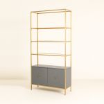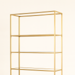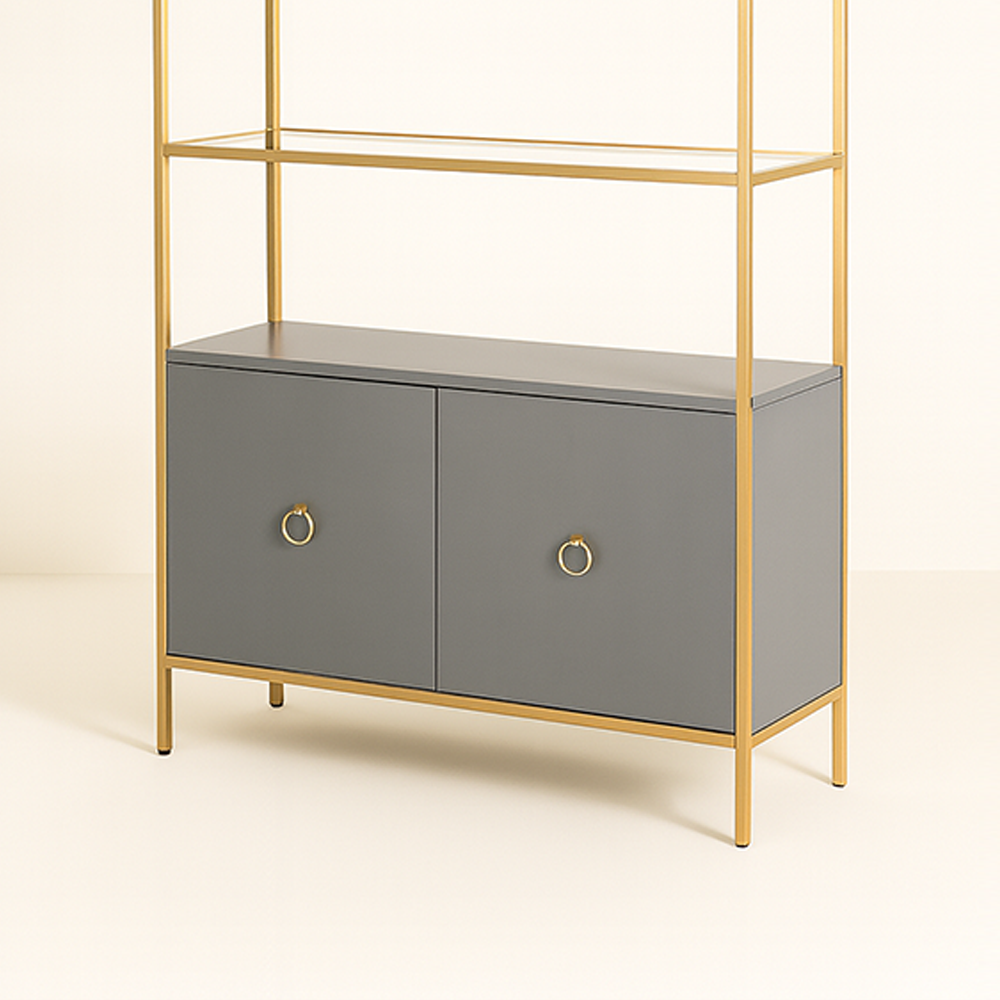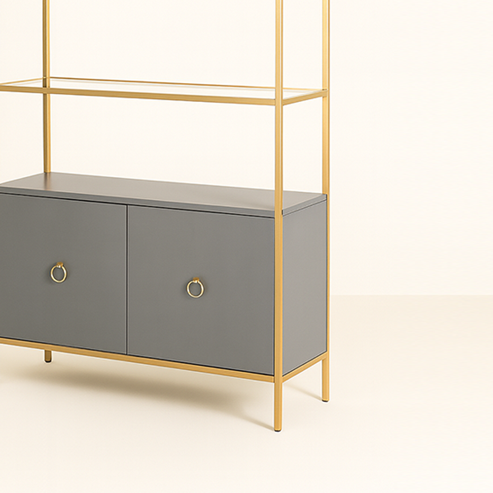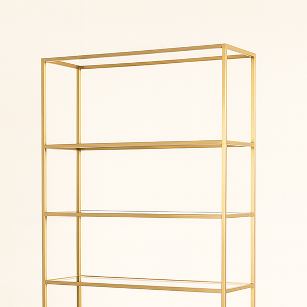 A modern display cabinet with a golden frame, open glass shelves, and a chic closed base.
