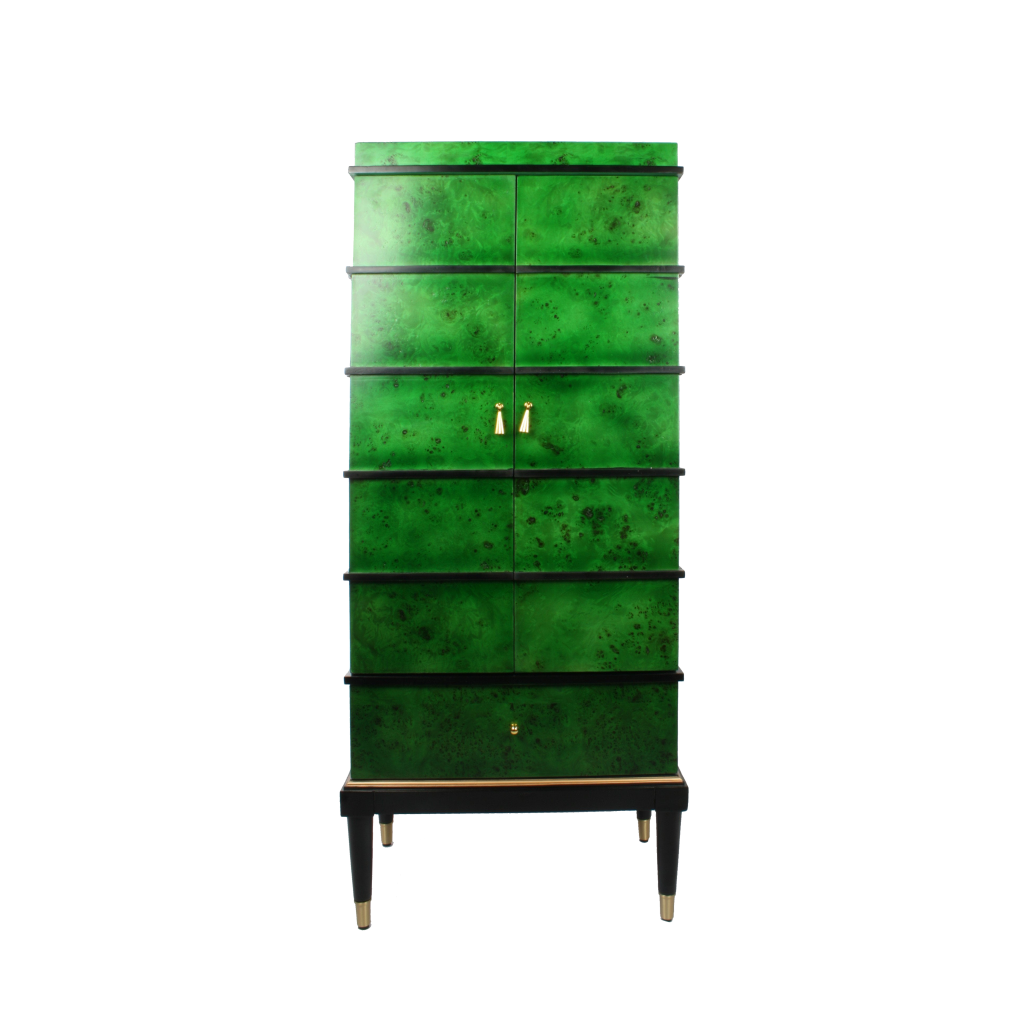 Its golden frame with glass shelves creates a luxurious yet minimalist statement piece.