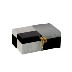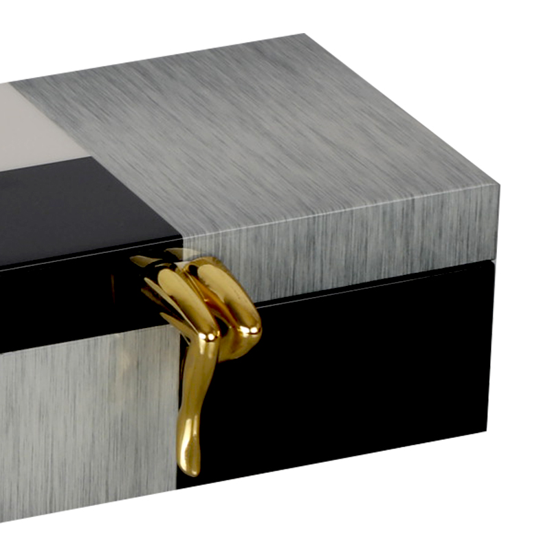 Sleek, modern storage box featuring a brushed metallic finish and glossy black accents. Highlighted by a distinctive gold-colored handle, this elegant piece is perfect for storing valuables or adding a sophisticated touch to any room.