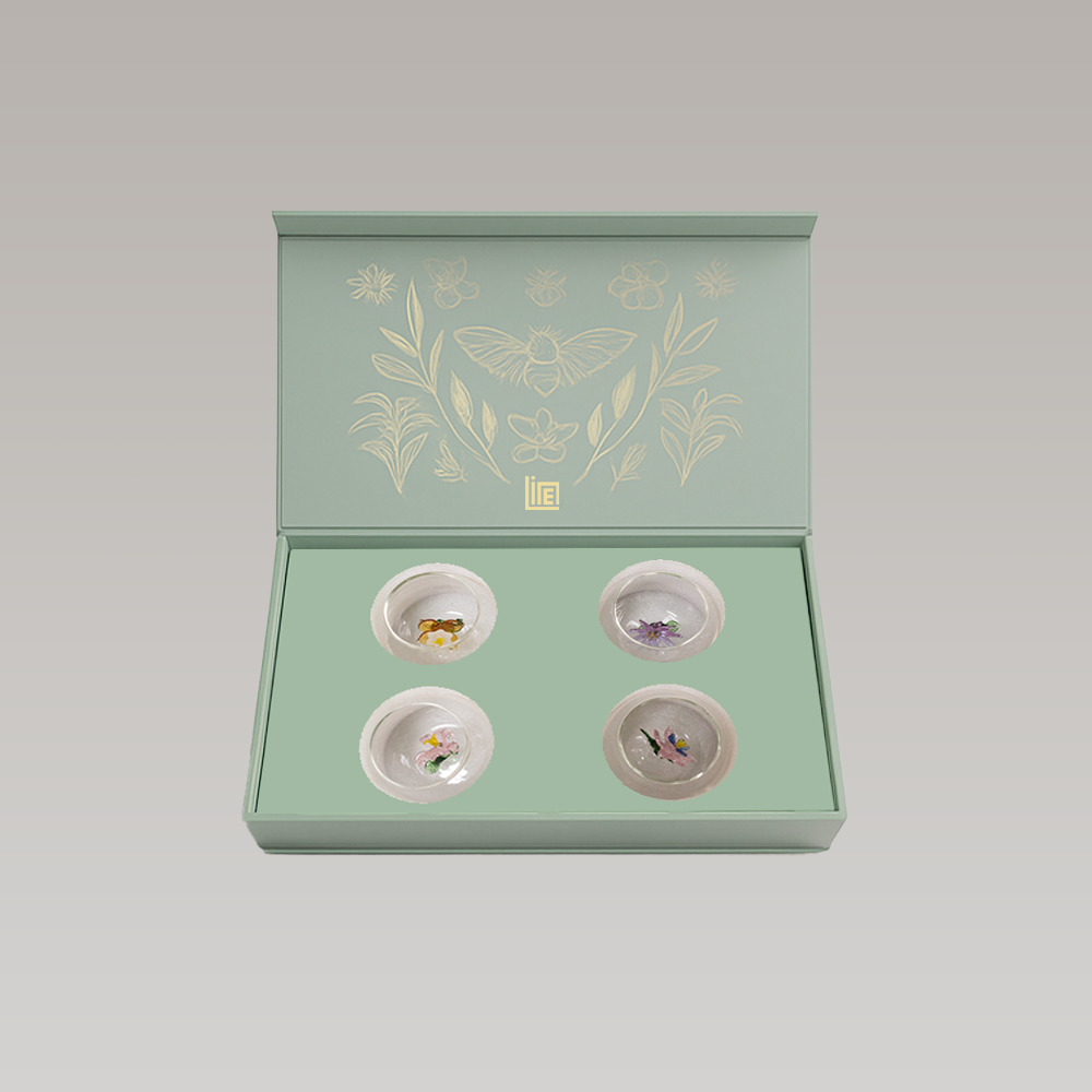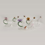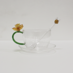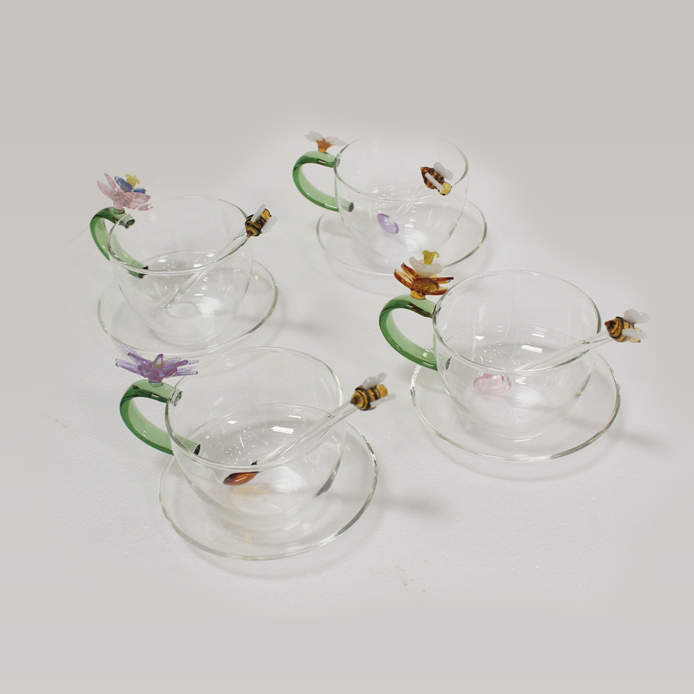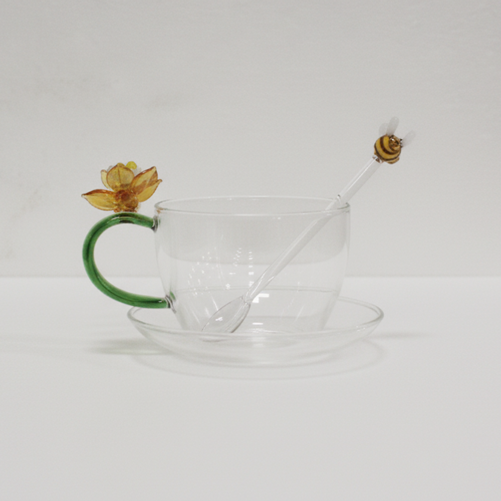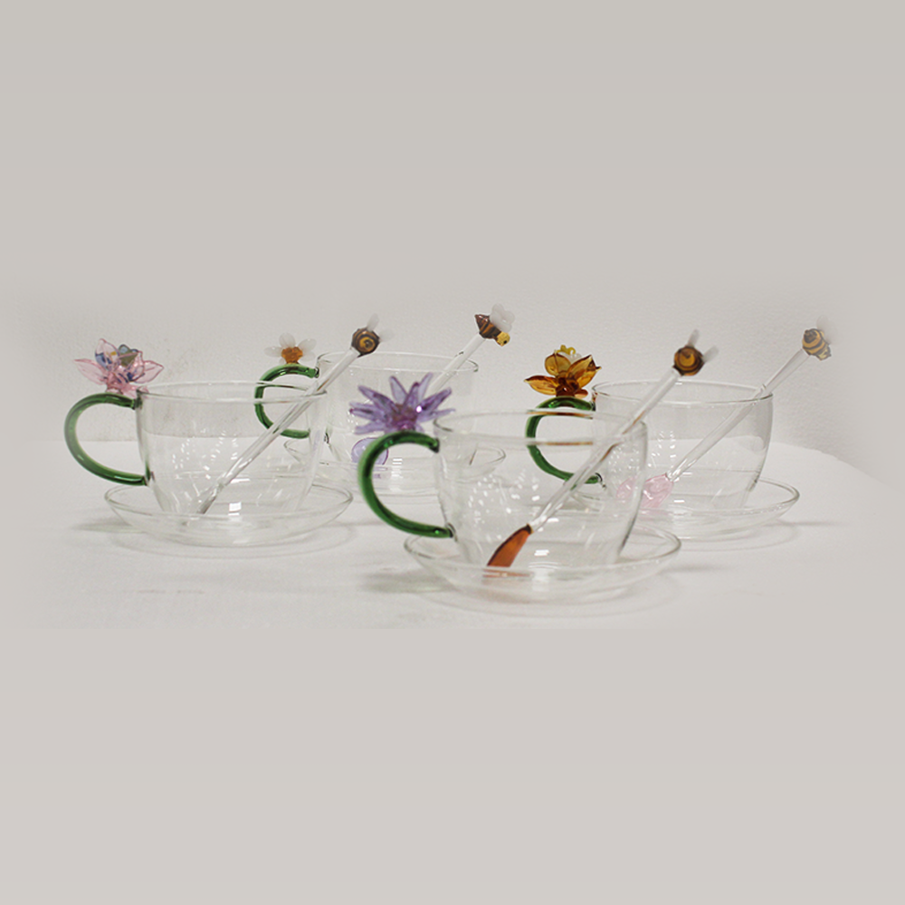 A hand-crafted floral glass cup set with bee stirrers, blending elegance and nature-inspired artistry. Perfect for refined tea and coffee moments.