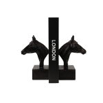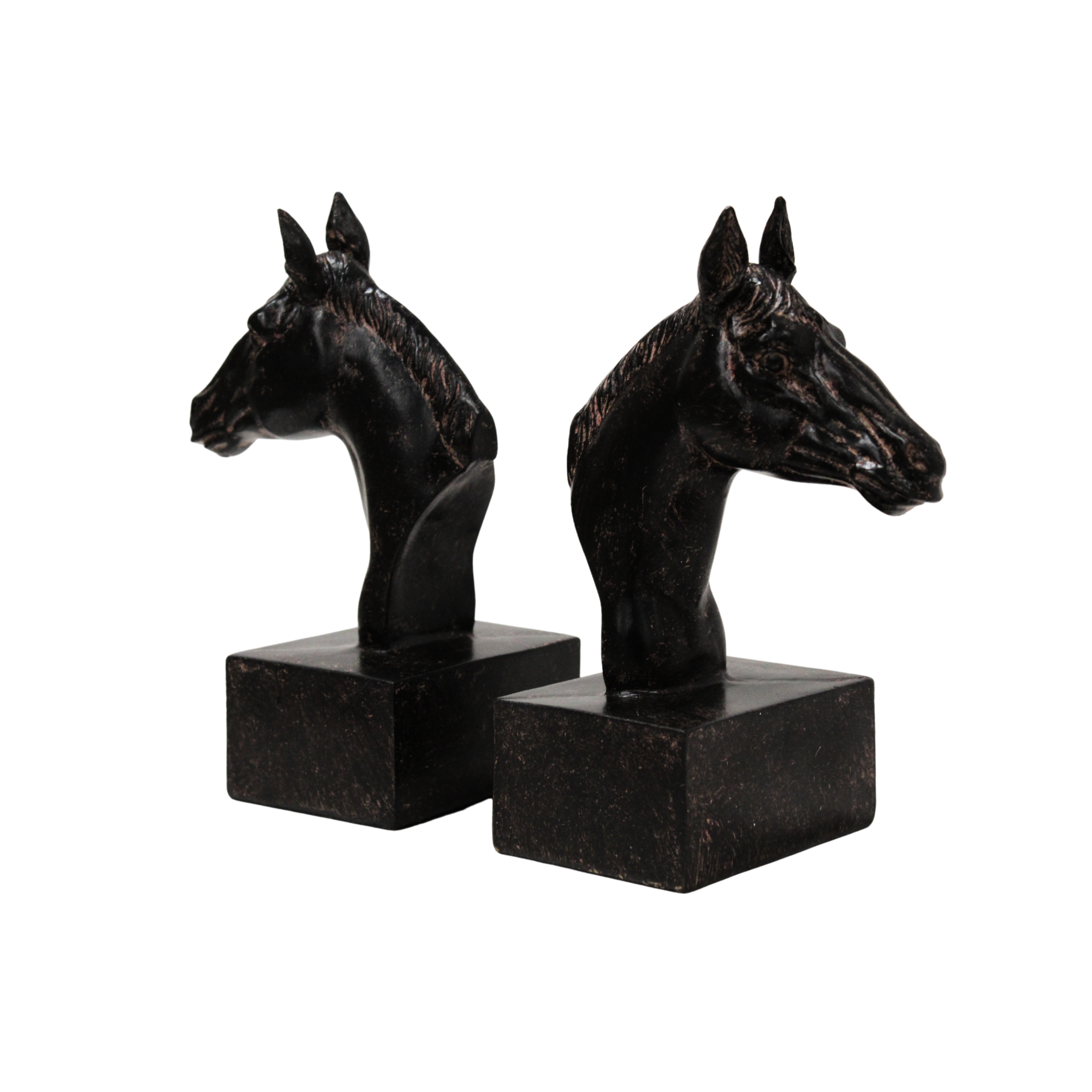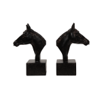 This sophisticated pair of bookends features detailed, dark-finish horse heads emerging from a rich, rectangular base, lending a sense of classic, equestrian elegance to any literary collection. They are ideal for organizing and accentuating a bookshelf or desk in a home library, study, or office.