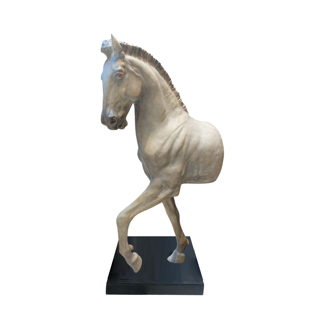 This commanding artwork is a large-format sculpture crafted with meticulous detail, presenting the chest, neck, and head of a muscular horse in a powerful, dynamic pose with one foreleg raised. The light-toned, smooth finish highlights the refined contours and strong anatomy of the animal, lending it an air of classical nobility and grace. Mounted securely on a substantial, contrasting black pedestal, the sculpture achieves a striking visual balance between the organic, spirited form of the horse and the sleek, modern base. This piece serves as an unforgettable focal point for a grand entryway, living room, or study, making a sophisticated and dramatic statement about equestrian elegance and fine art.