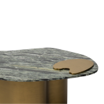 This is a luxurious and modern coffee table featuring a natural-edge green marble top supported by a sculptural, curved brass or bronze-toned metallic base.