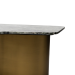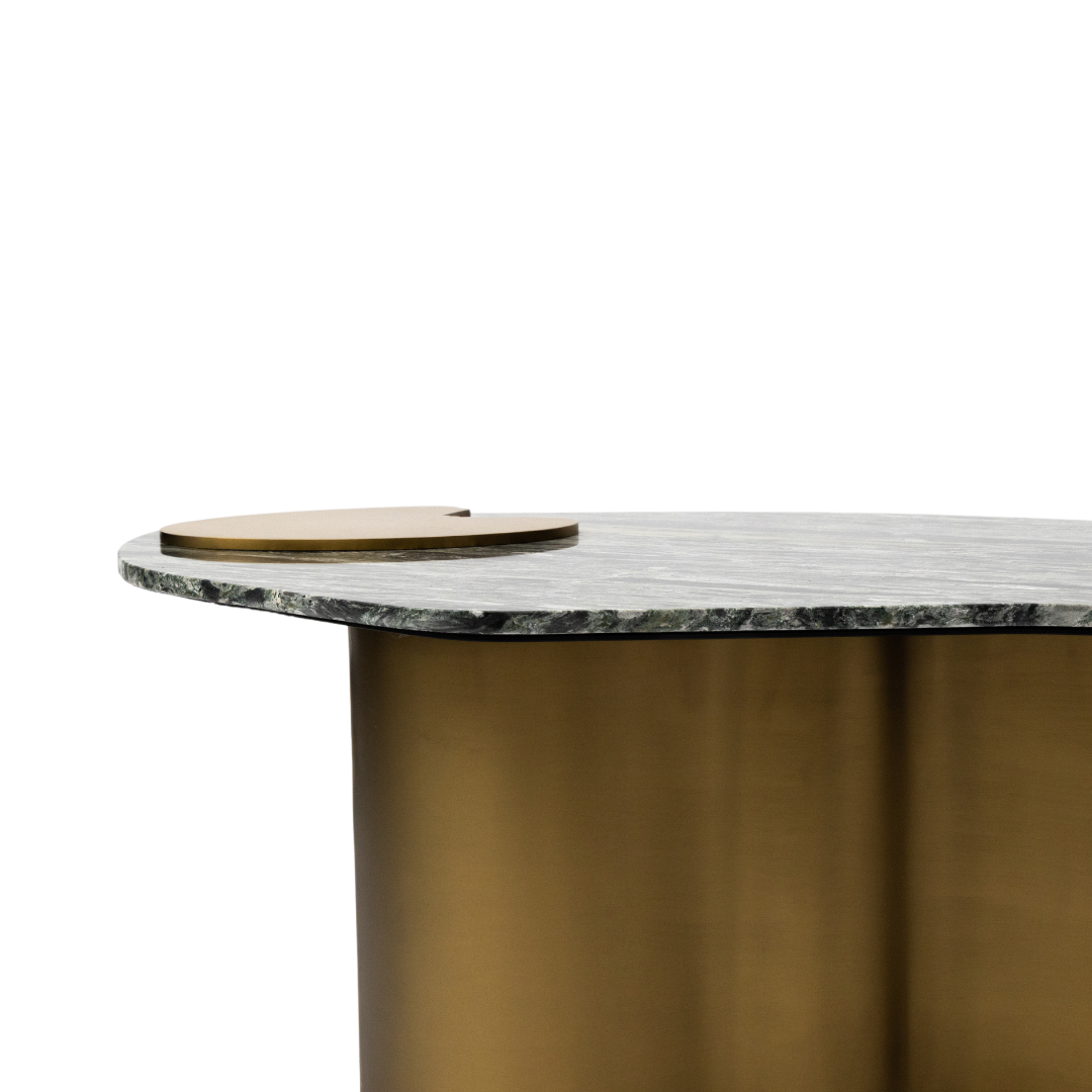 This striking coffee table embodies high-end contemporary design, showcasing a thick, oblong tabletop crafted from rich green or gray marble with a distinct natural, uneven edge for organic appeal. The top is dramatically contrasted by the smooth, substantial pedestal base, which is finished in a warm metallic bronze or brass color and features a beautifully curved, wave-like silhouette. A small, contrasting gold disc is thoughtfully integrated near one edge of the marble top, adding a functional or decorative element of artistic asymmetry. This piece serves as an opulent centerpiece for any sophisticated living room, blending natural material with sleek, modern curves.